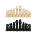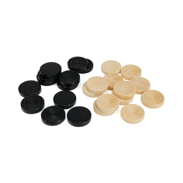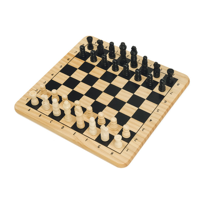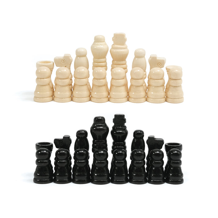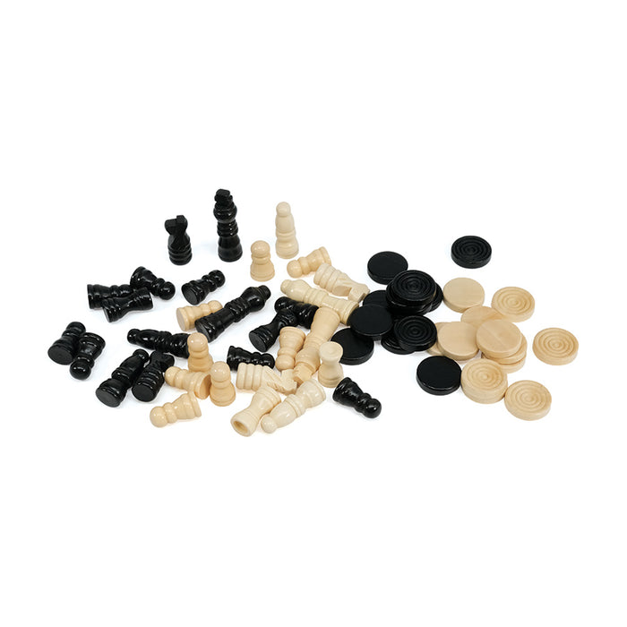 Includes 24 wood checkers, 32 wood chess pieces, wood playing board.