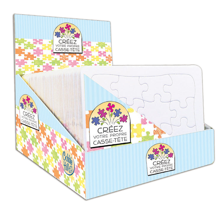 It's the French version of our Create Your Own Puzzle 5 x 7 Postcard! This is a pre-packed display of 48 5 x 7 postcard puzzles that can be personalized with paints, pencils, markers, or crayons. Once the pieces are removed, the tray reveals a blank canvas for drawing or writing a message. It's the perfect gift and a cherished keepsake that is also a work of art.