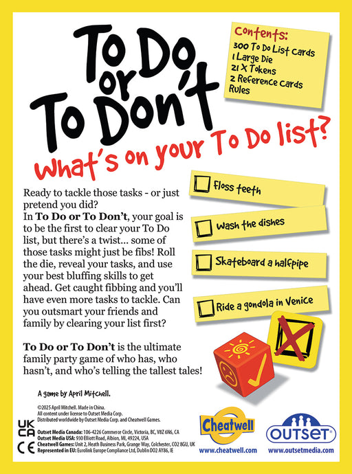 10984Original price $20.00 - Original price $20.00Original price$20.00$20.00 - $20.00Current price $20.00| /TO DO OR TO DON'T is a race to complete your To-Do list, but not everything is as it seems. Some tasks are just clever fibs! Roll the die, reve...