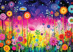 An array of rainbow coloured flowers stand tall and proud under the night sky, just as the sun is setting. The grassy field is full of colour. This is an Enjoy 1000 piece puzzle created with AI assistance.