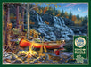 The Waterfall Camp at night is the most spectacular site with a roaring fire that glows under the starry sky. A canoe rests next to the fire after being out on the water on a fishing expedition. With only one cup by the coffee canteen and a single jacket hanging from the trip, it appears to be a solo trip for one lucky autumn wanderer.