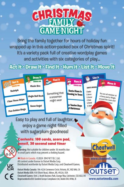 18882Prix d'origine $15.00 - Prix d'origine $15.00Prix d'origine$15.00$15.00 - $15.00Prix actuel $15.00Le jeu d'activités de Noël propose des centaines de cartes avec différentes activités de Hum it! Trouve le! Agissez ! Dessine le! Déplacez-le ! Dé...