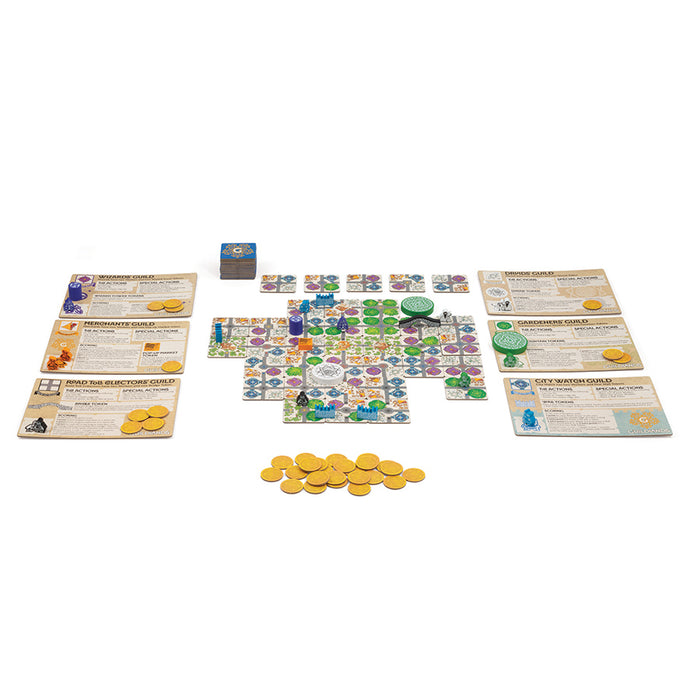 In the world of Dragoria, the realm of Thornshire lies in chaos.A horde of ancient dragons have devastated the land, reducing cities and towns to smouldering ruins. Survivors have retreated into caves, waiting for the chance to rebuild their lives.Thornshire’s Queen has issued a royal decree: the Guilds must restore the realm and surpass its former glory.The capital city of Ferrum’s Ford will rise again, shaped by the finest craftspeople of the Royal Guilds:Road Toll Collectors, Merchants, Gardeners, Wizards, Druids and the City Watch.