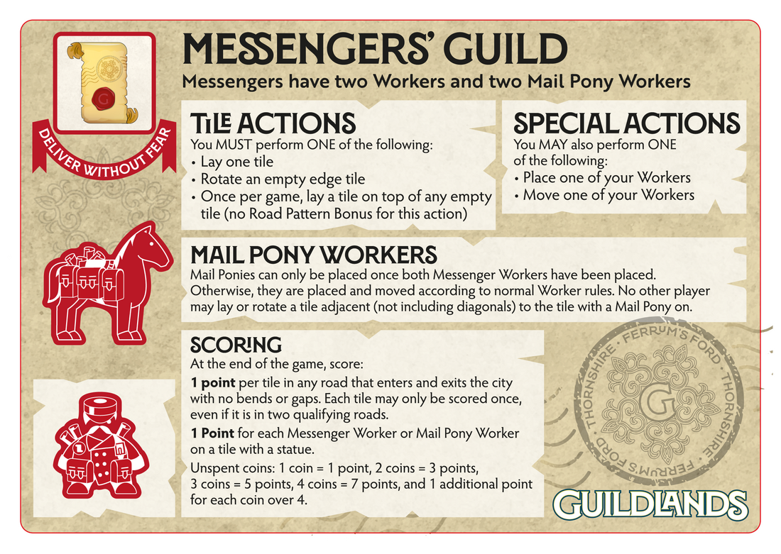 Guildlands is an asymmetric tile laying game of strategy and sabotage for 2 - 6 players, ages 10+, playtime 40 - 60 minutes, designed by Kedric Winks and Ken Boyter.