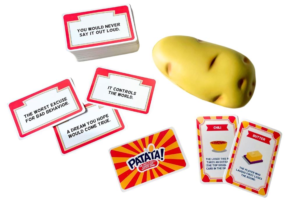 Turn up the heat at your next party with Patata 18+, a hilariously spicy, fast-talking card game where quick thinking and quick hands rule. Perfect for breaking the ice (or melting it), this adult party game has no player limit, making it a must-have for everything from college hangouts to bachelorette blowouts. One player flips a theme card, answers with a word or phrase, and tosses the squishy foam potato before the timer runs out. Get caught holding it? That’s a penalty! With 100 cheeky, double-sided theme cards, 9 wild topping cards to spice things up, and endless laughs, PATATA! is a high-energy addition to The Darker Side Games Collection joining Slingz, Analyze Me, and Shut Up!